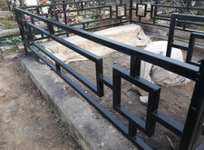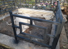 Возвращаемся на могилу. Подготавливаем оградку к покраске, зачищая её от старого покрытия. Параллельно устанавливаем подставку для памятника.