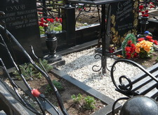 Состояние могилы после небольшого цикла работ. Покрашена лавка и ограда, обновлены розочки на ограде, помыты памятники и гранитный цоколь, убраны цветники и сорняки, почищена мраморная крошка. На могилу возложили свежие цветы.