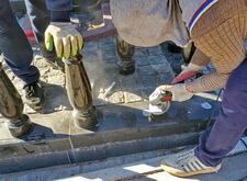 В углу участка делаем лавочку. Брусчатку под её ножками зачищаем, всё выставляем по уровню, для дополнительной надёжности конструкция удерживается е только на клею, но и на штырях. Параллельно делаем верх одного из памятников.