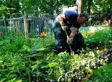 Уборка могилы на сельском кладбище